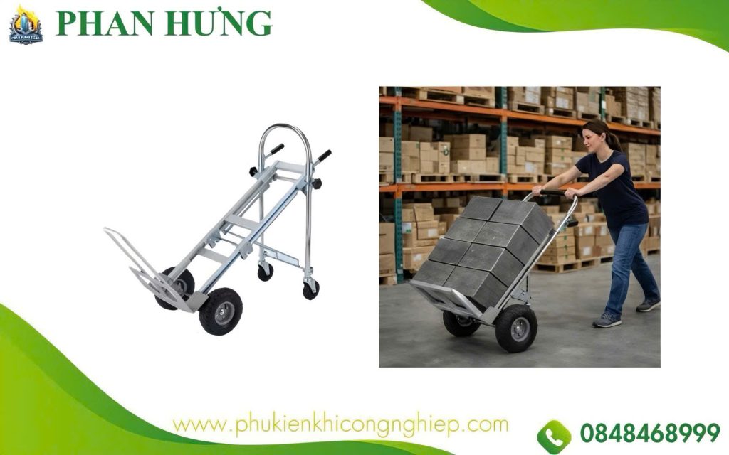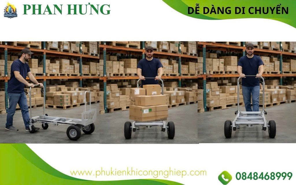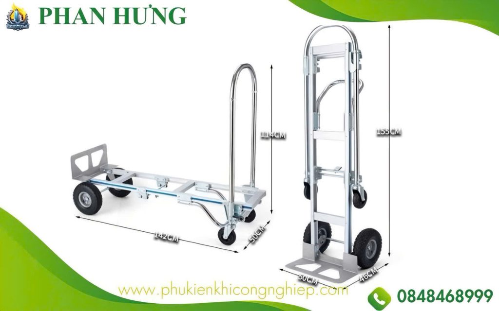 Với thiết kế xe đẩy đa năng 2 trong 1, người dùng có thể linh hoạt thay đổi chế độ sử dụng phù hợp từng loại hàng hóa